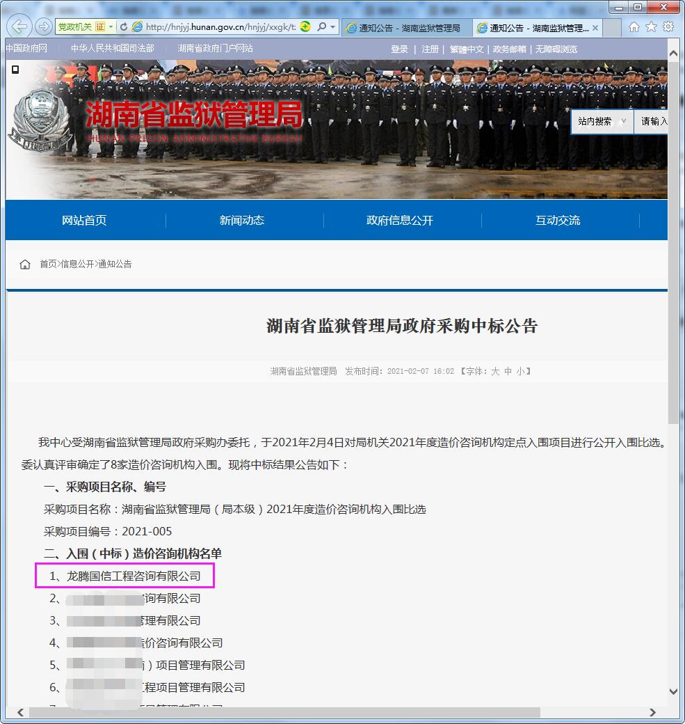 恭賀我司中標(biāo)湖南省監(jiān)獄管理局2021年度造價咨詢機(jī)構(gòu)庫