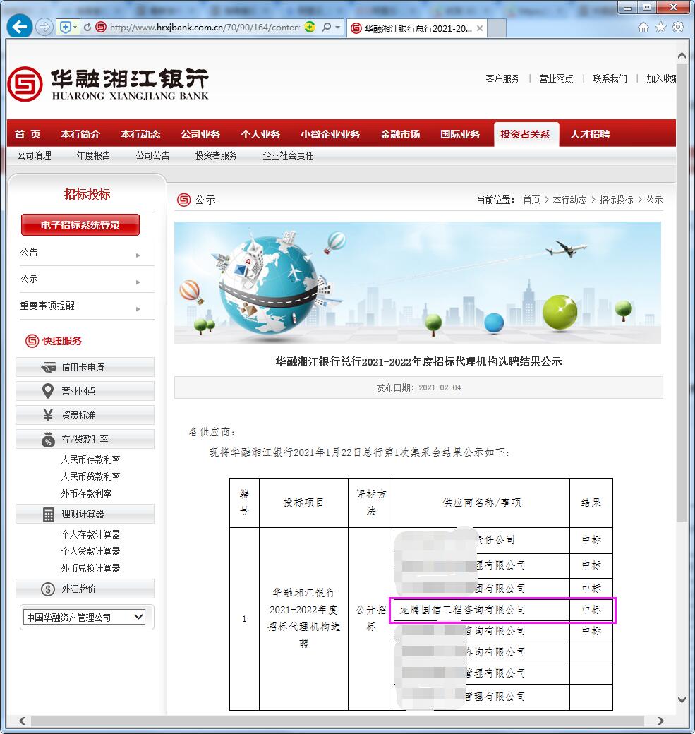 恭賀我司中標華融湘江銀行總行2021-2022年度招標代理機構庫
