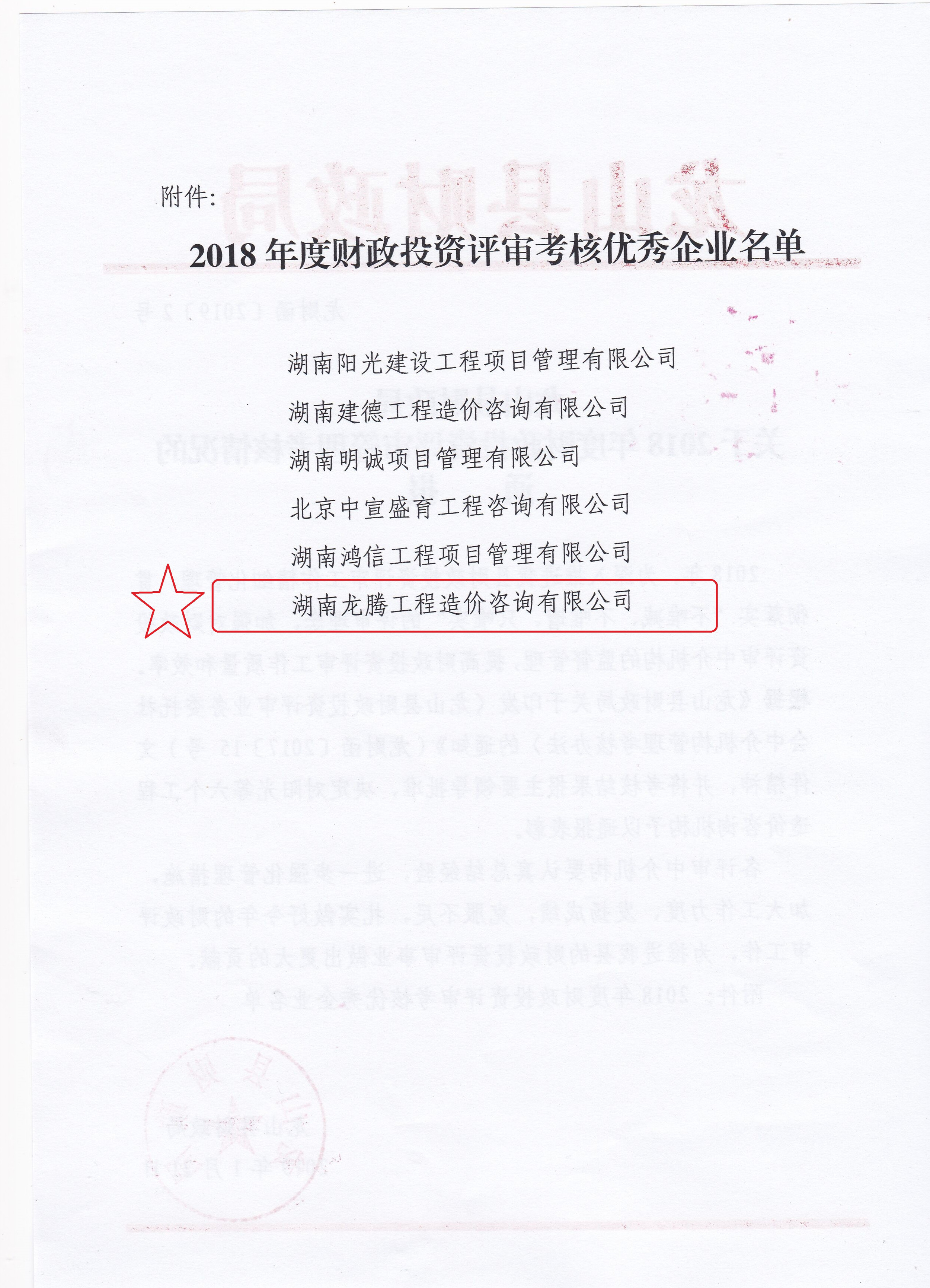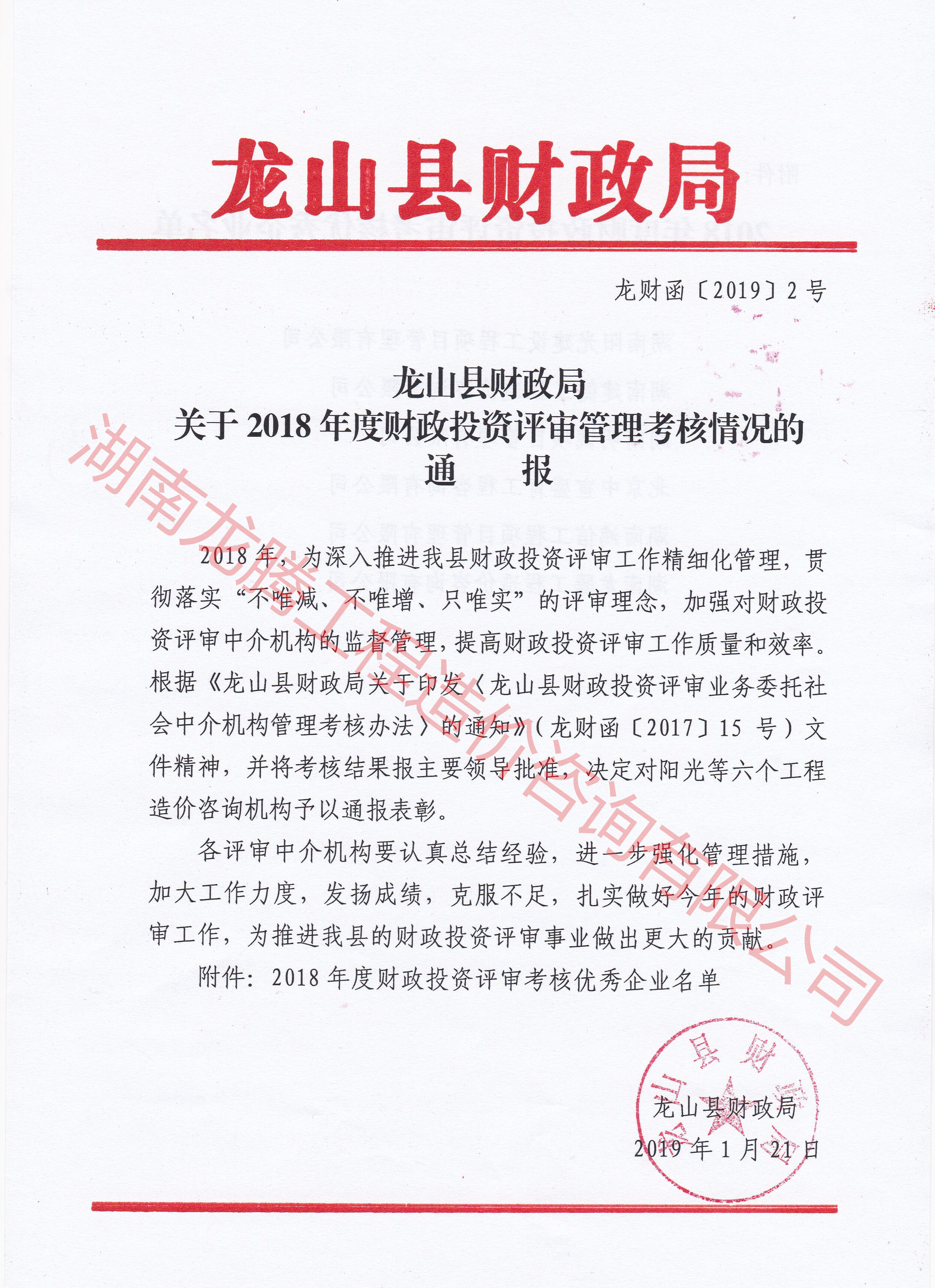 熱烈祝賀我公司被龍山縣財(cái)政局評為2018年度造價咨詢優(yōu)秀企業(yè)