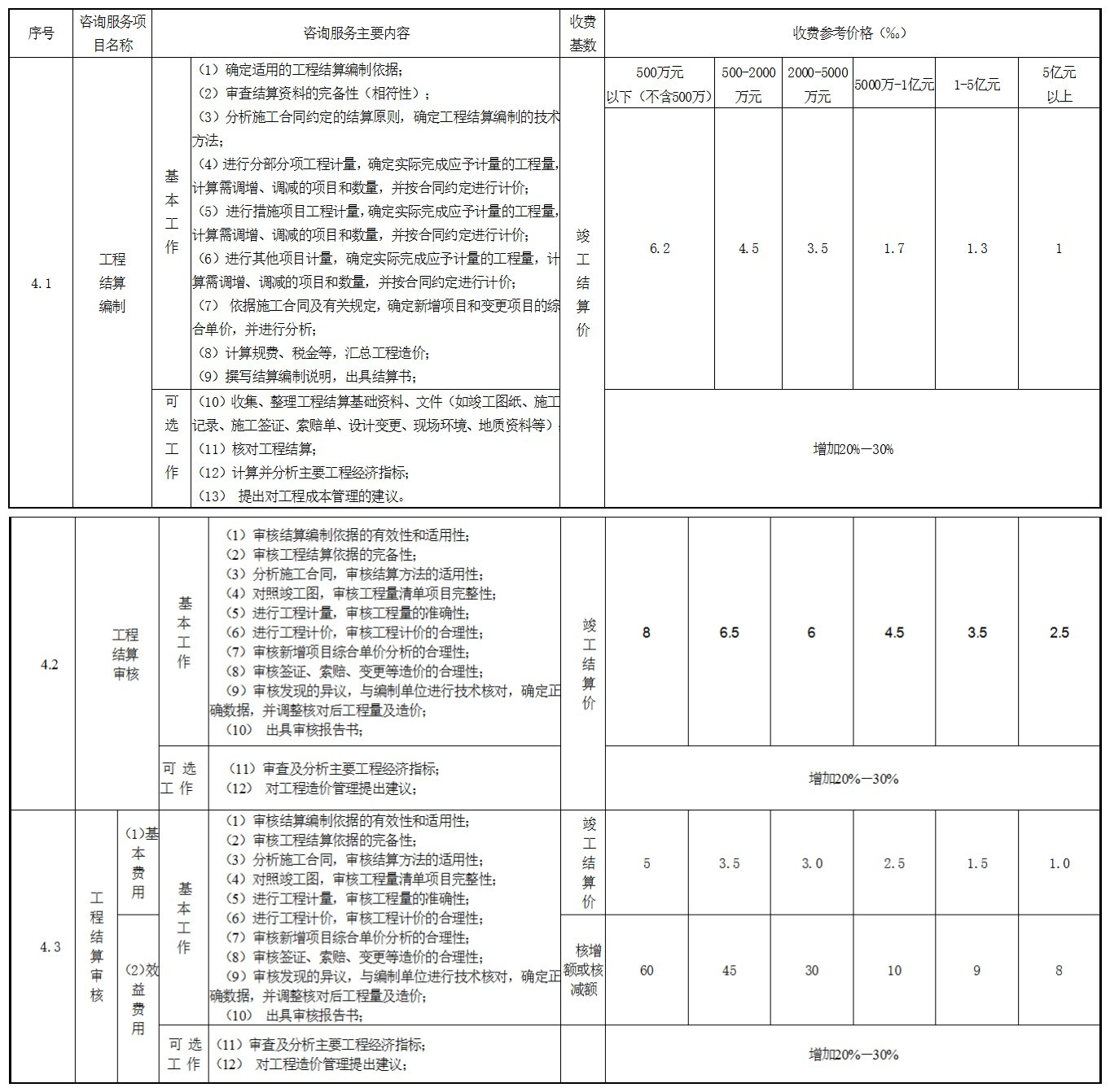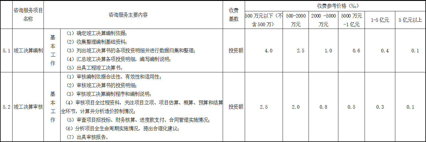 竣工決算編制或審核的咨詢服務收費參考價格表