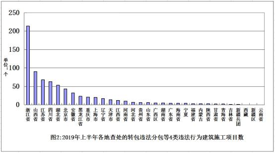 從查處的轉(zhuǎn)包、違法分包等4類違法行為看,浙江、山西、江蘇3省查處項目相對較多(見圖2)。