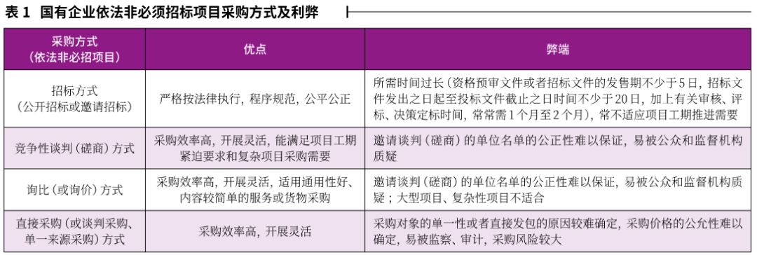 對(duì)于國有企業(yè)依法非必須招標(biāo)項(xiàng)目,可以選擇招標(biāo)方式,也可以選擇競爭性談判、競爭性磋商、詢比(或詢價(jià))、直接采購(或談判采購、單一來源采購)等方式,這些方式各有利弊,具體見表1。