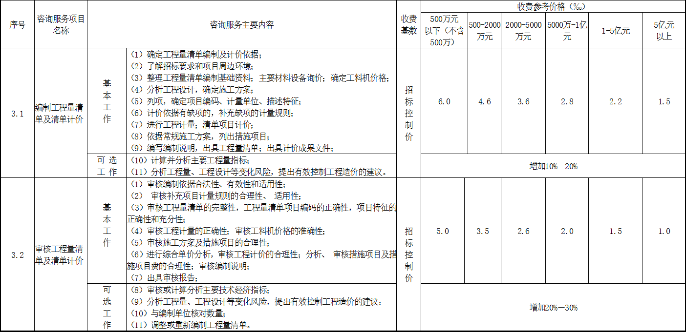 工程預算(工程量清單及計價)編制或審核收費參考價格表