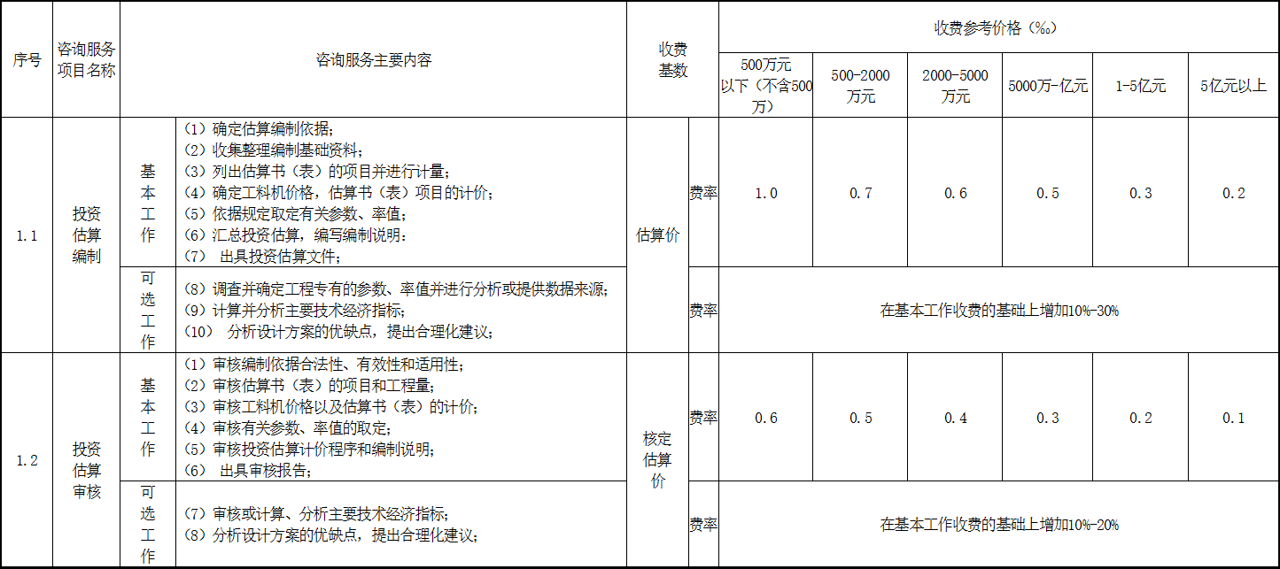 三、為方便各工程造價咨詢企業(yè)制訂收費標準,應工程造價咨詢企業(yè)要求,省建設工程造價管理協(xié)會制定了造價咨詢行業(yè)咨詢服務收費參考價格表供會員參考(見附件)。咨詢服務收費參考價格表包括投資估算、工程概算、工程預決算、工程結算、竣工結算、全過程造價咨詢、工程造價糾紛鑒定、全過程跟蹤審計10個表格,咨詢服務項目包含基本工作和可選工作。省造價協(xié)會將根據市場情況定期公布咨詢費率的變化指數(shù)。
