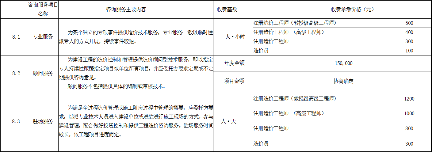 3、全過程造價咨詢服務駐場人員根據工程項目情況及委托人要求確定,駐場人員的收費價格參考“造價咨詢工日收費參考價格表”。