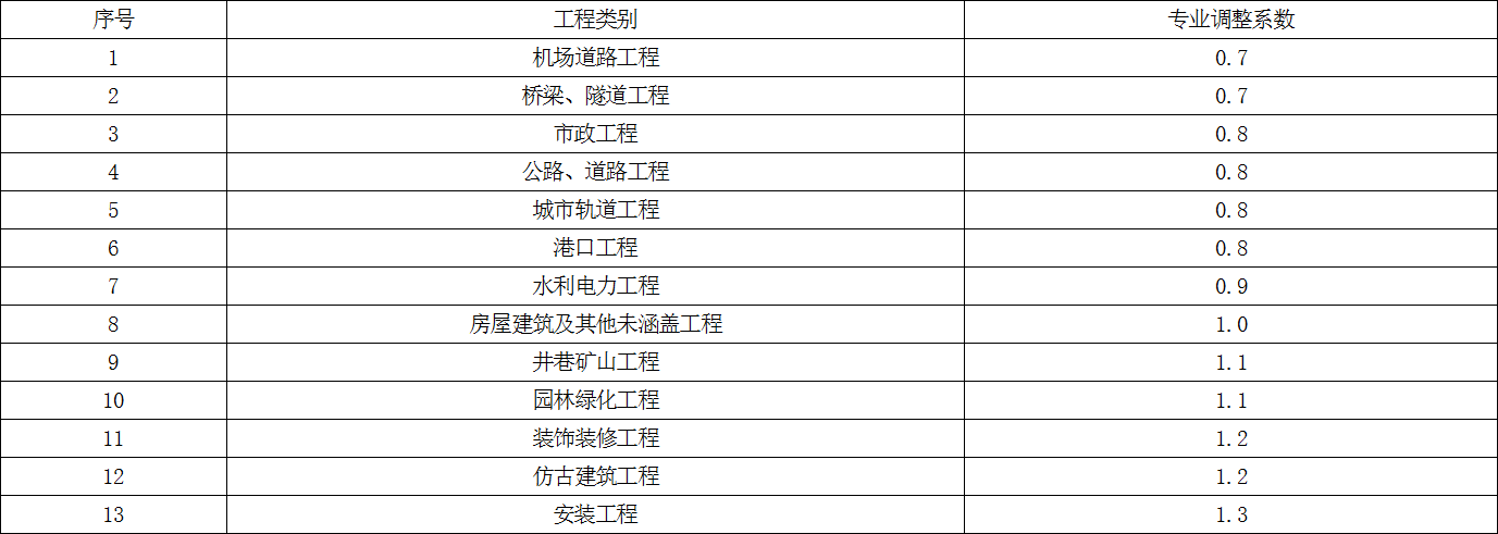 注:1、房屋建筑工程和其他未涵蓋的專業(yè)調整系數(shù)為1;